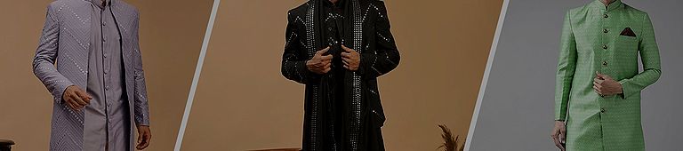 Sherwani with Churidar Pajama – Our Silk blend Sherwanis seamlessly display traditional designs that embellish the fabric opulently. The Sherwani comes with a contrasting colored Churidar pant which lends a comfortable fit without compromising its style statement. This combination becomes a fashionista favorite for wedding functions.